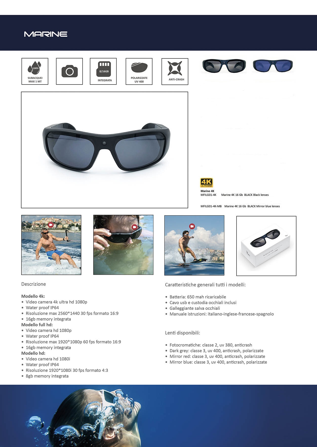 Provvisti di galleggiante (e subacquei fino ad 1 metro), sono dotati di una videocamera  4K FULL